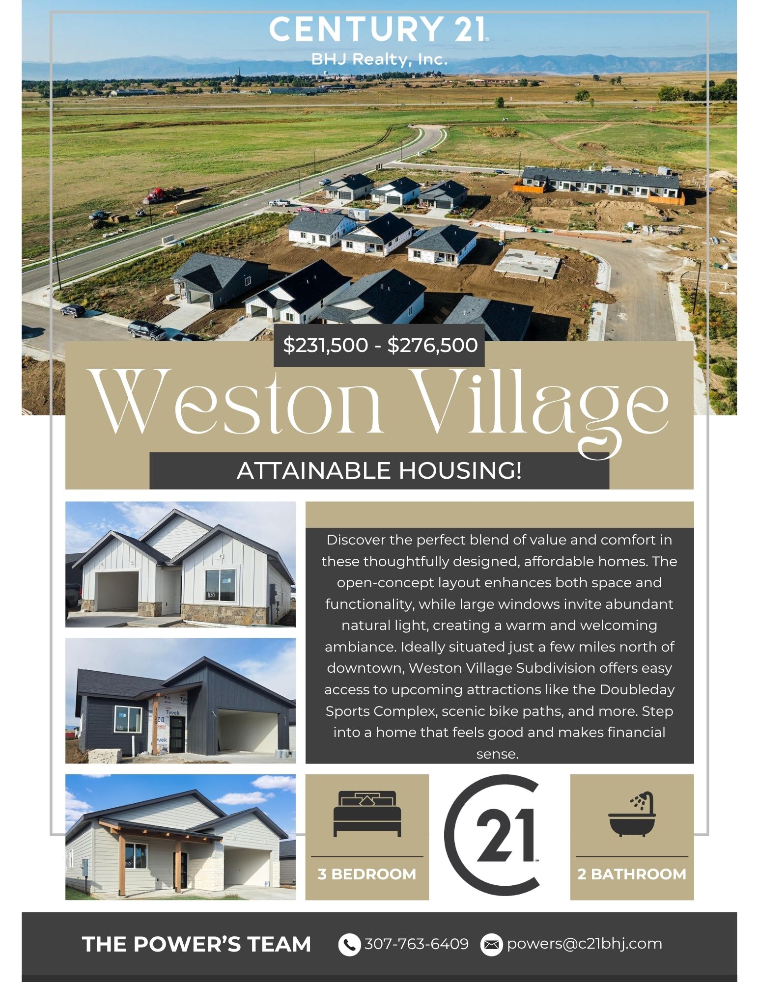Weston Village is more than just a neighborhood — it’s an opportunity to build stability, enjoy modern comfort, and be part of a welcoming community close to Sheridan. With special program opportunities designed to make homeownership attainable, now is the time to see what’s possible. The Powers Team is here to answer your questions, guide you through qualification, and help you find the home that’s right for you.