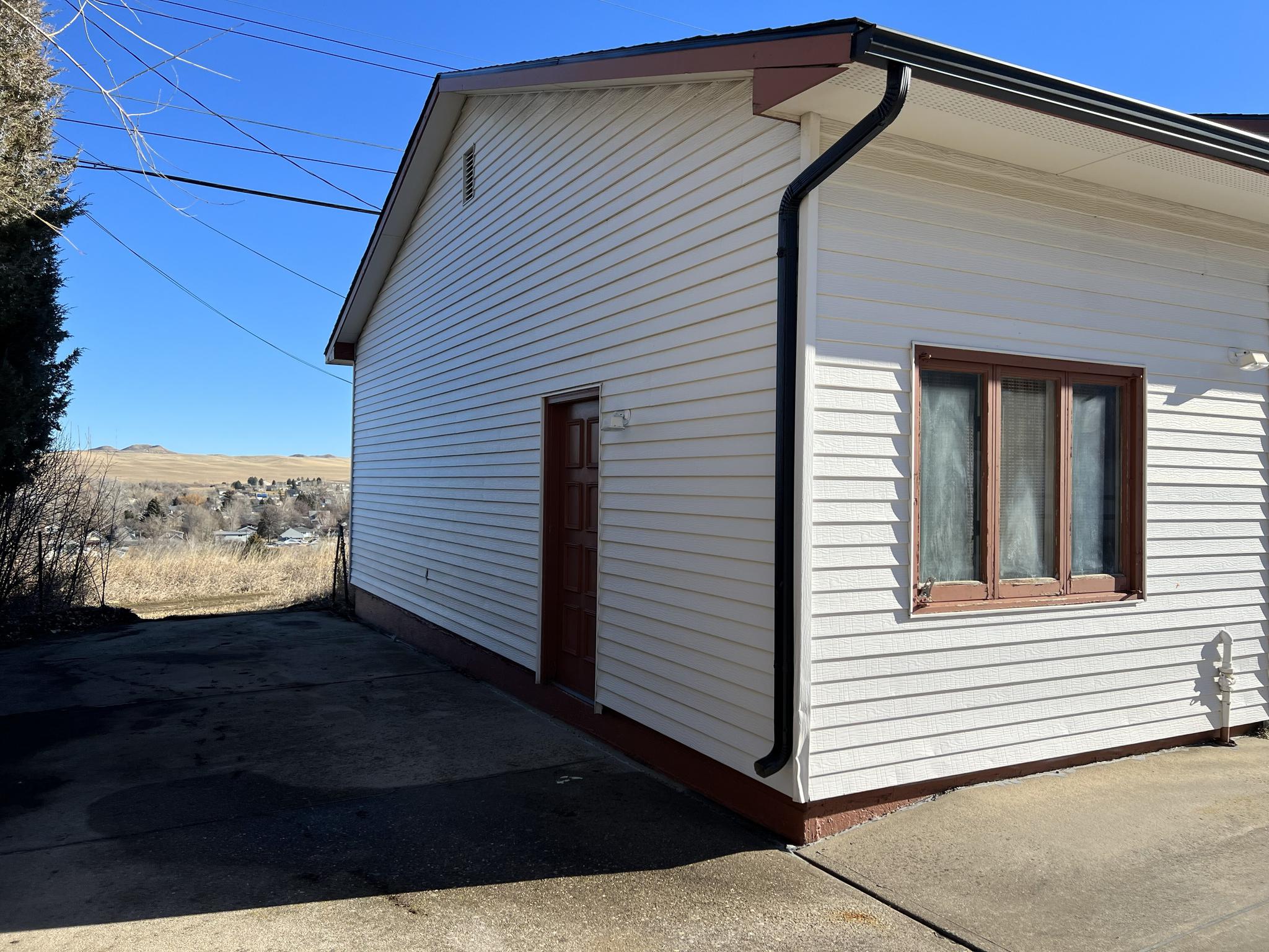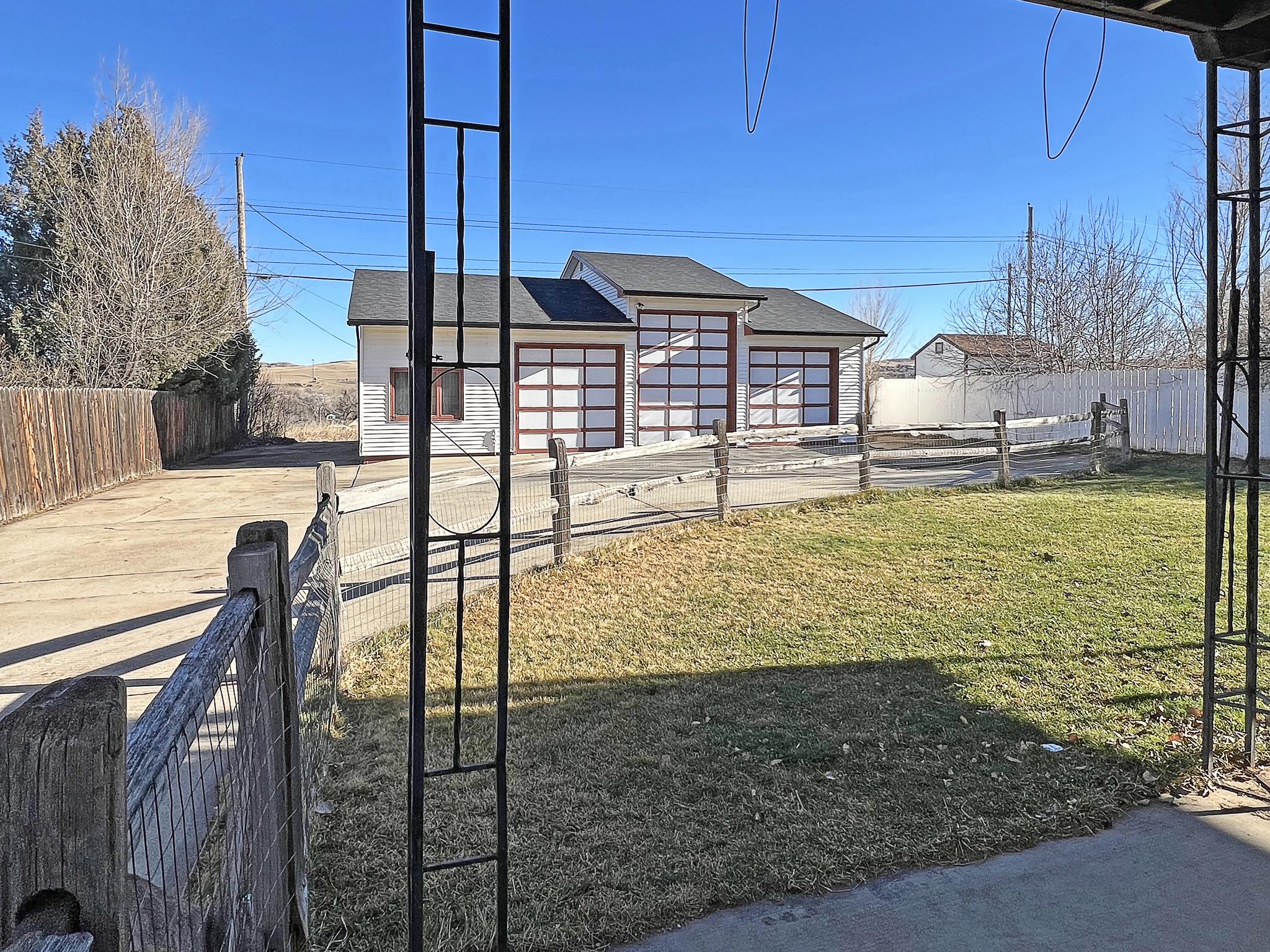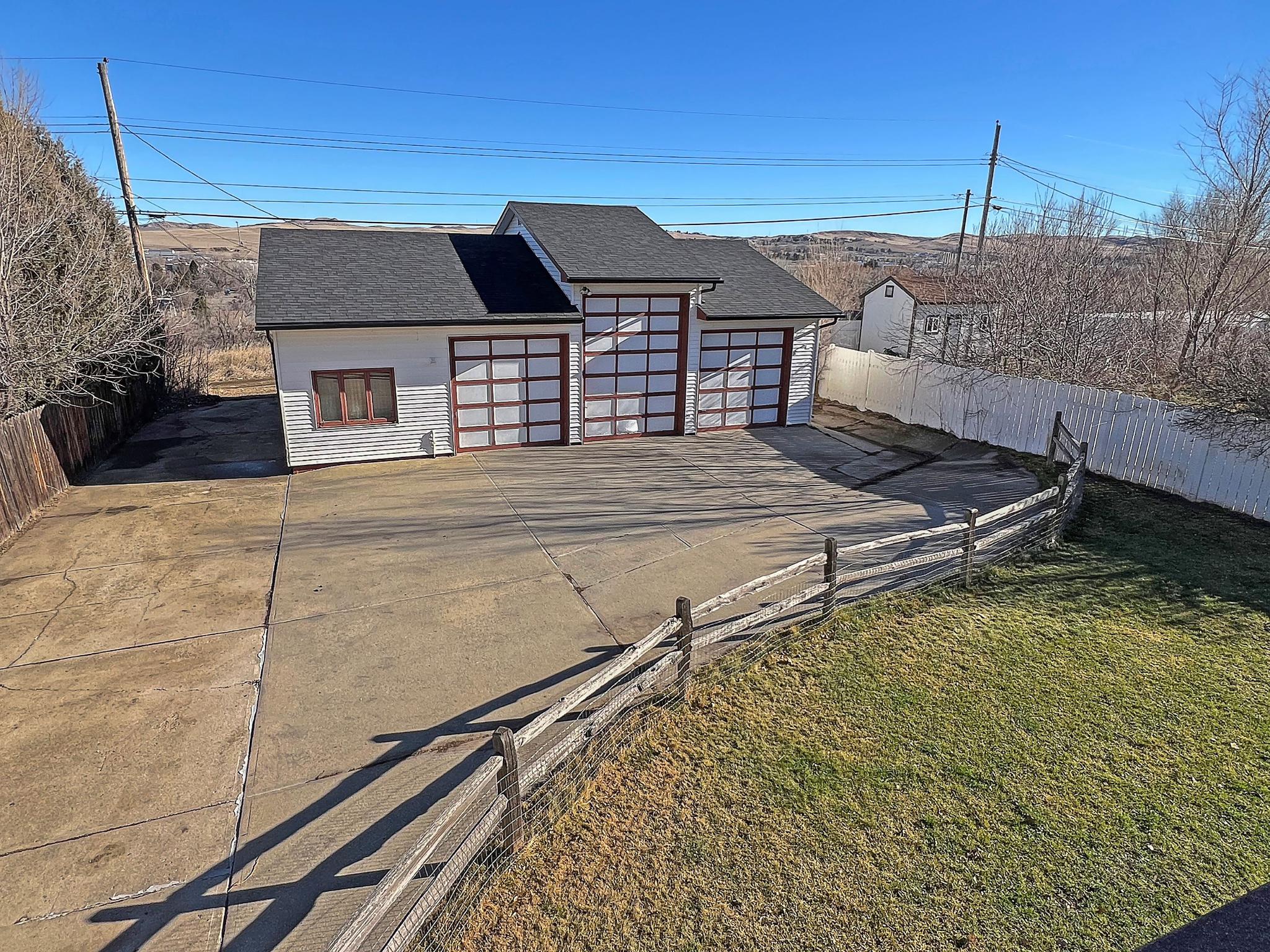 Ranch-style home with a walk-out basement, attached two-car garage, and a large detached shop. This 3-bedroom, 2-bath residence features a new furnace and new roof. The upper-level living room includes sliding glass doors that open to a covered deck with scenic views of the eastern hills of Sheridan. The property offers a fenced backyard with an underground sprinkler system. The detached shop measures 44' x 32', totaling approximately 1,408 square feet, and is equipped with a walk-in door and three overhead doors—one 12-foot door and two 9-foot doors—providing excellent access for vehicles, equipment, or recreational storage. An overhead heater keeps the shop comfortable year-round. A rear concrete driveway provides ample additional off-street parking behind the home.