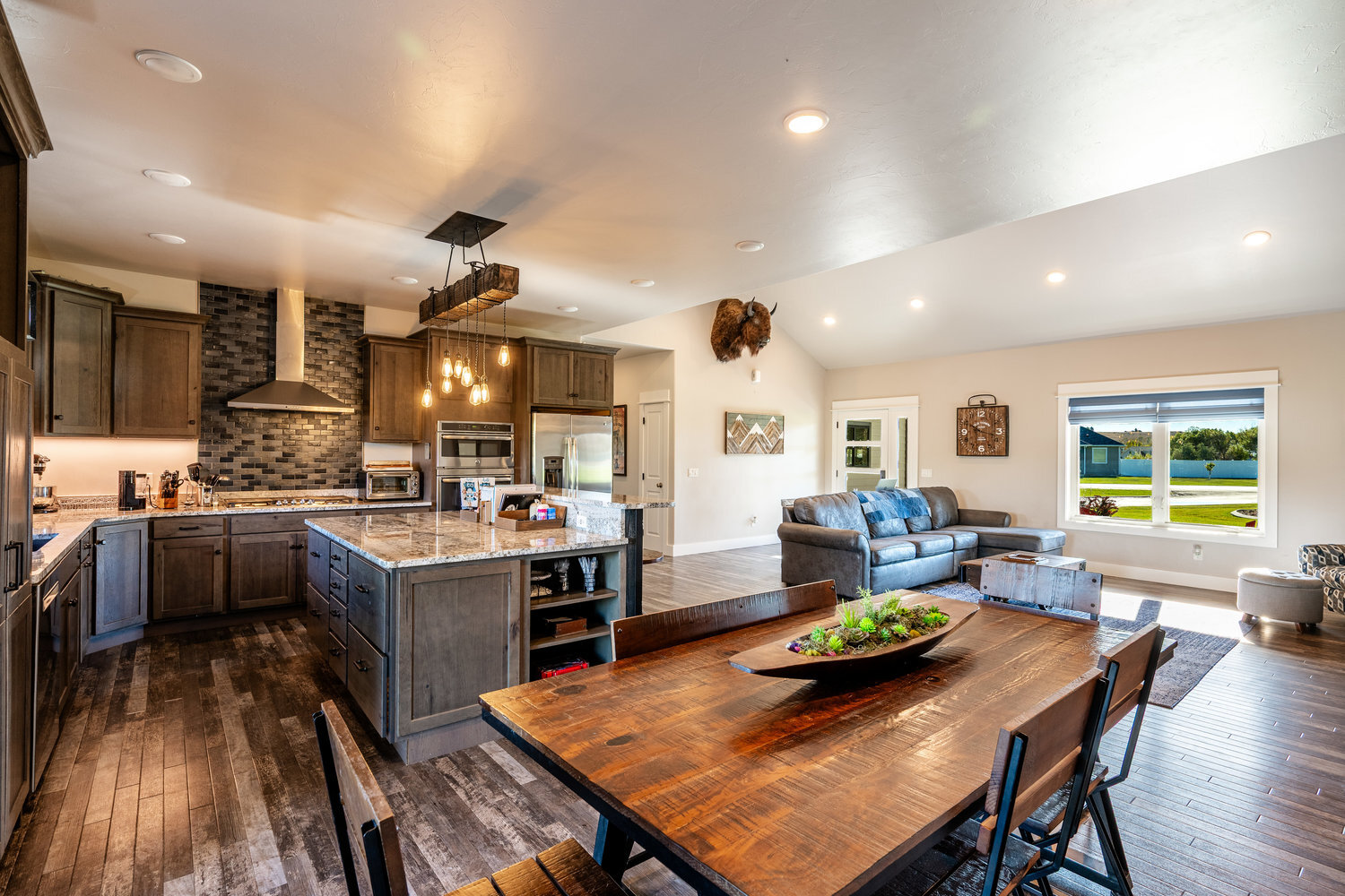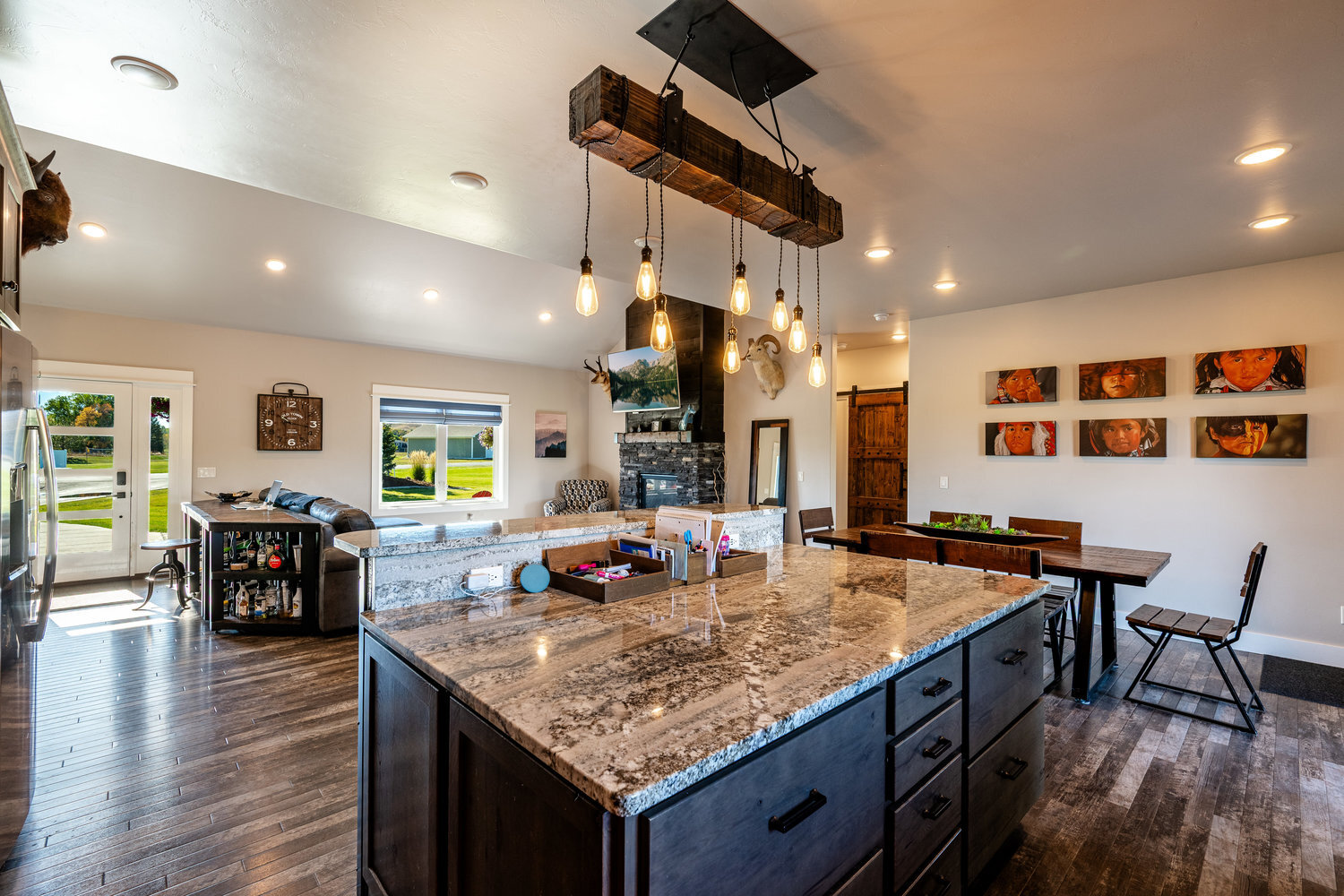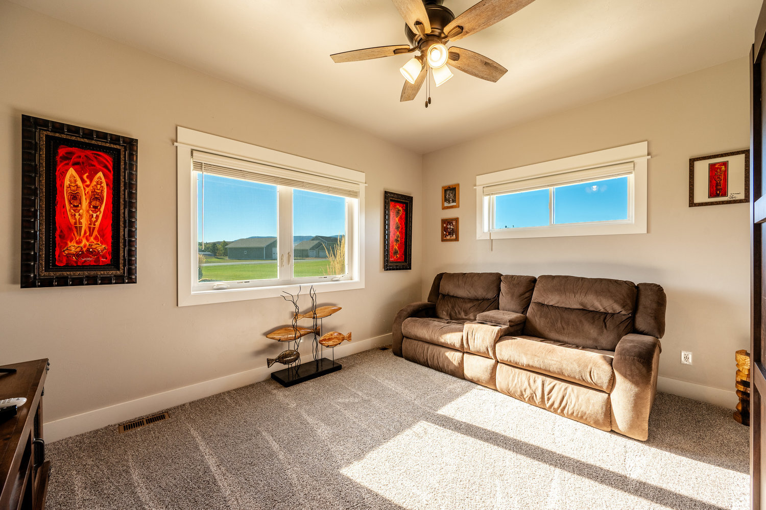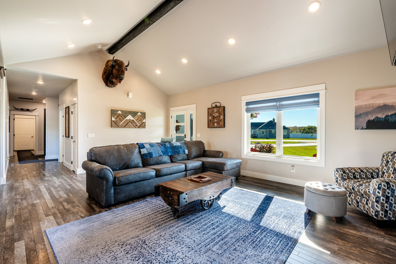 Beautiful custom home on 2.2 meticulously landscaped acres in the highly sought-after Big Horn School District! Thoughtfully designed with custom granite finishes and a well-appointed kitchen. The main level offers Jack & Jill bedrooms and a luxurious master suite with dual closets, double-sink granite vanity, dual shower heads, and skylight. A dedicated office and large bonus room provide flexible living space. The home includes a heated double-car garage, single-car garage with 50-amp power, and a 26′×40′ insulated shop with 14′ RV door, pass-through bays, floor drain, and RV hookups. Outside, enjoy a paved patio with built-in firepit, outdoor kitchen, and hot-tub pad surrounded by mature trees, a fenced yard, in-ground sprinklers, and a decorative waterfall.