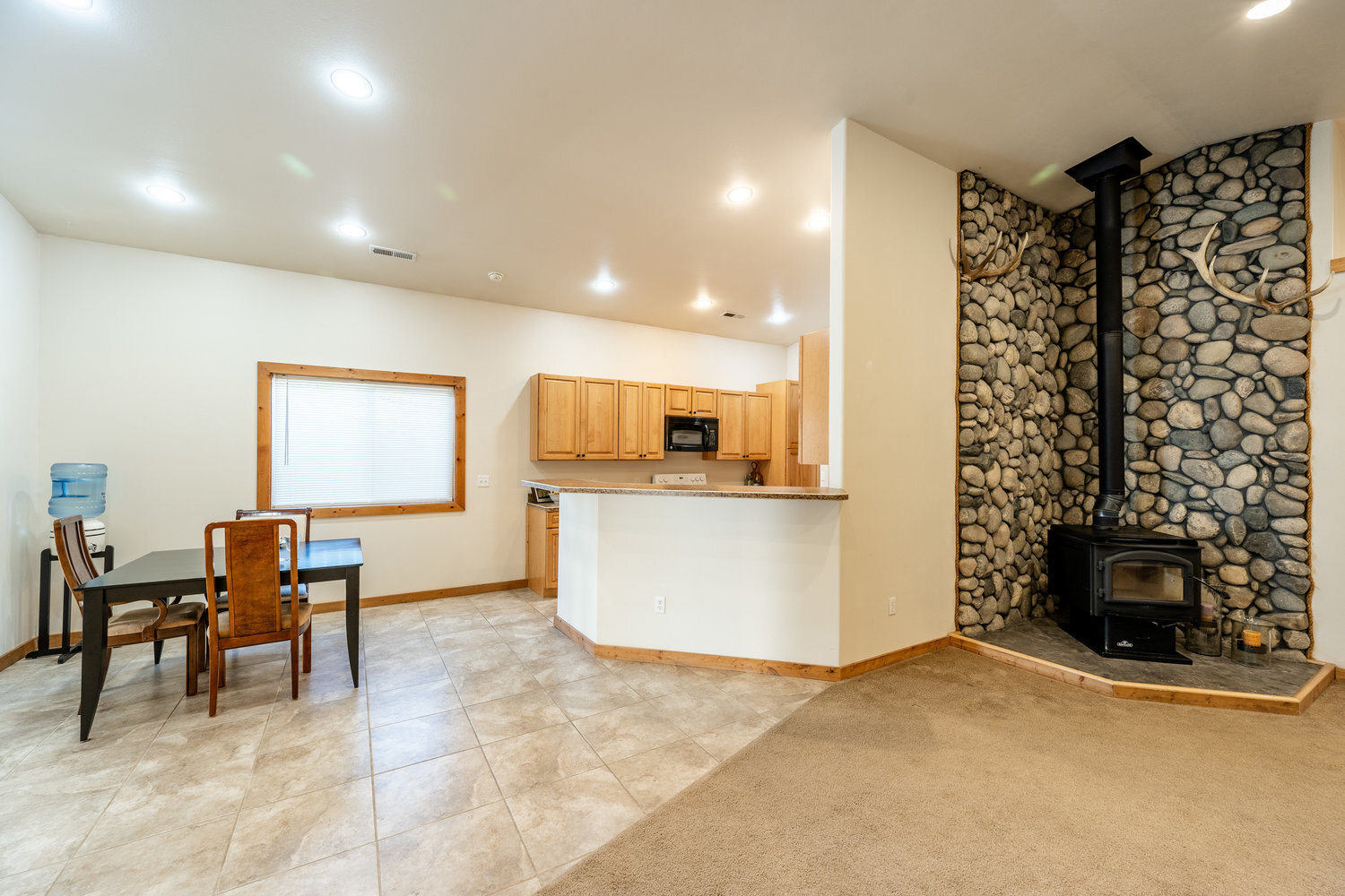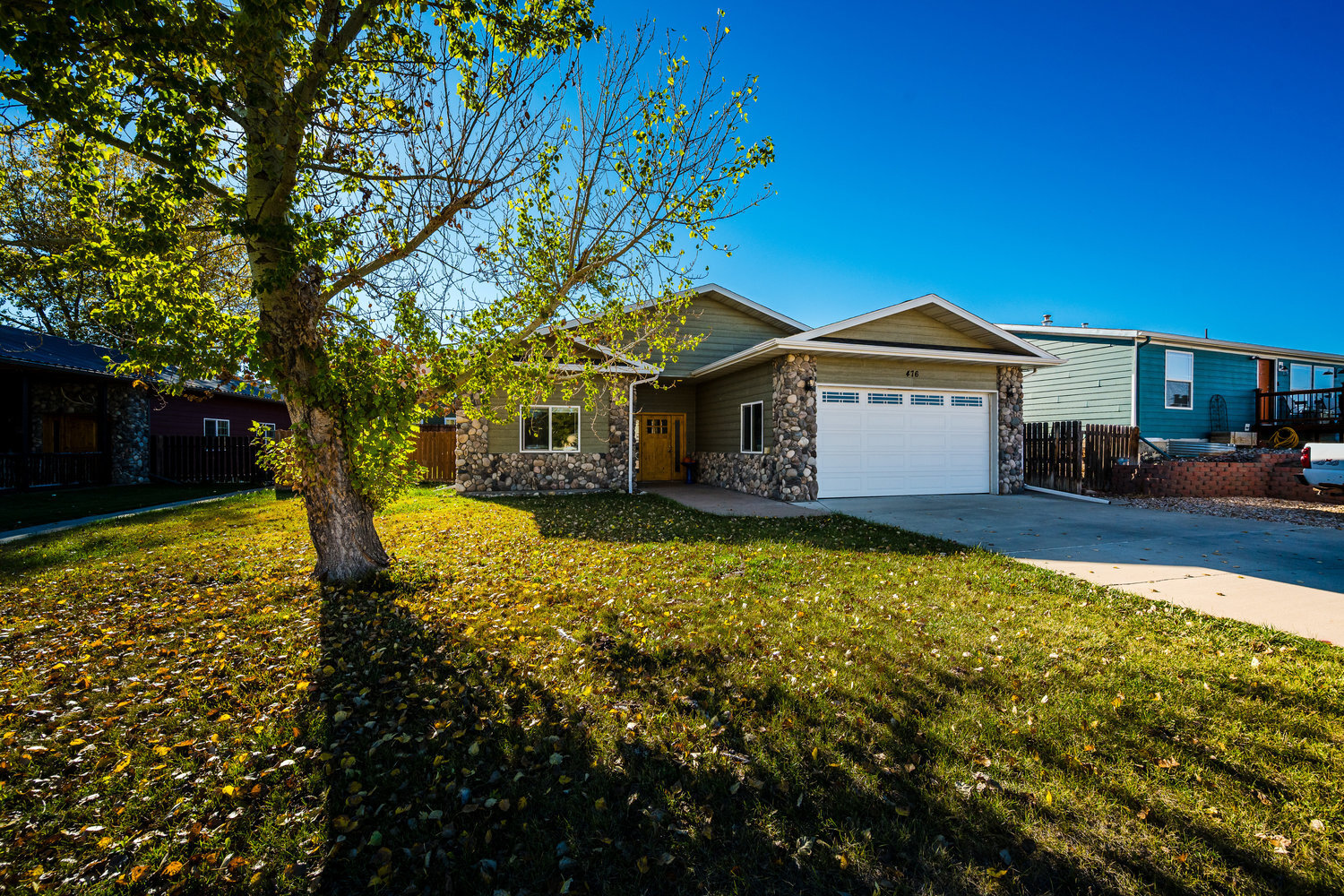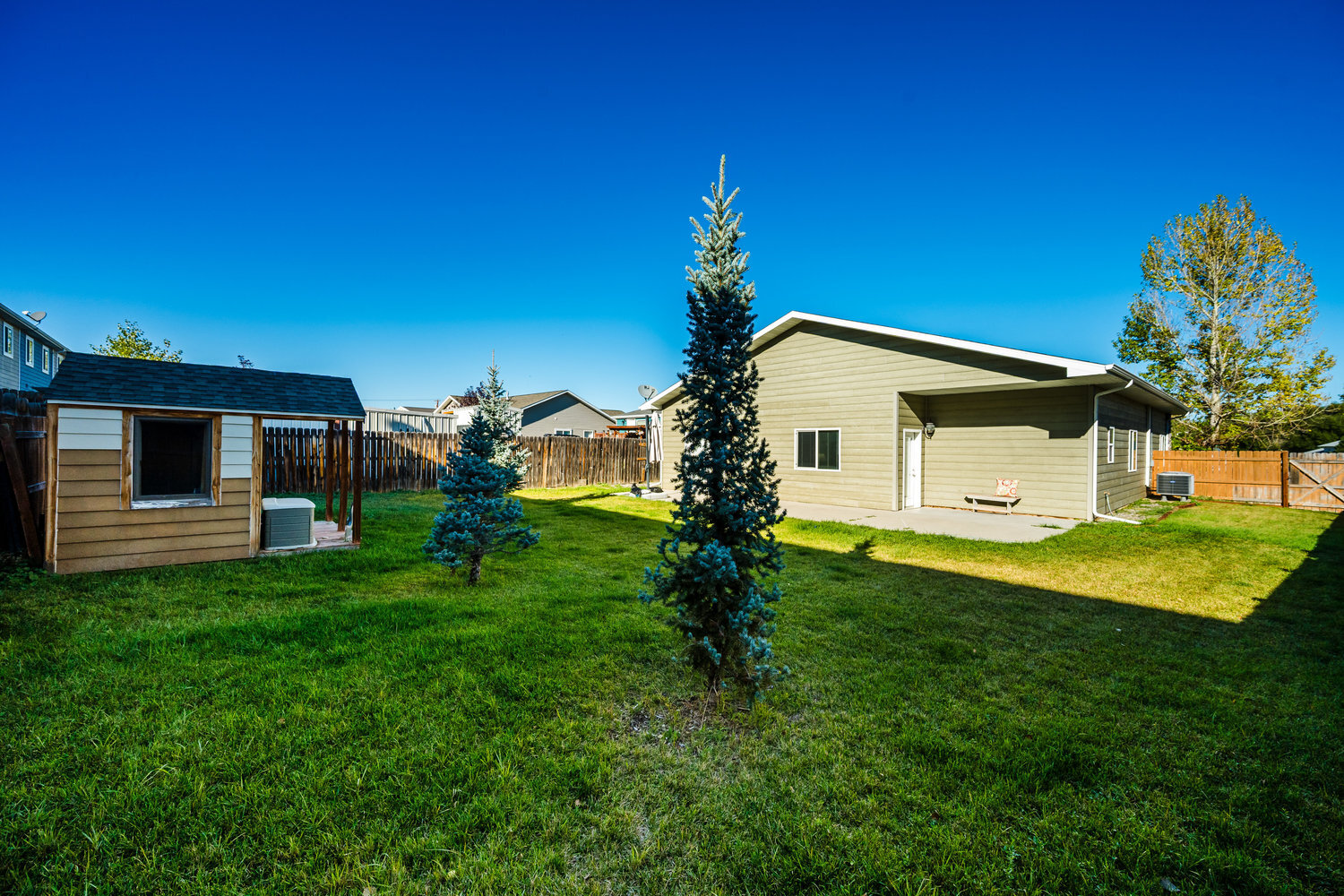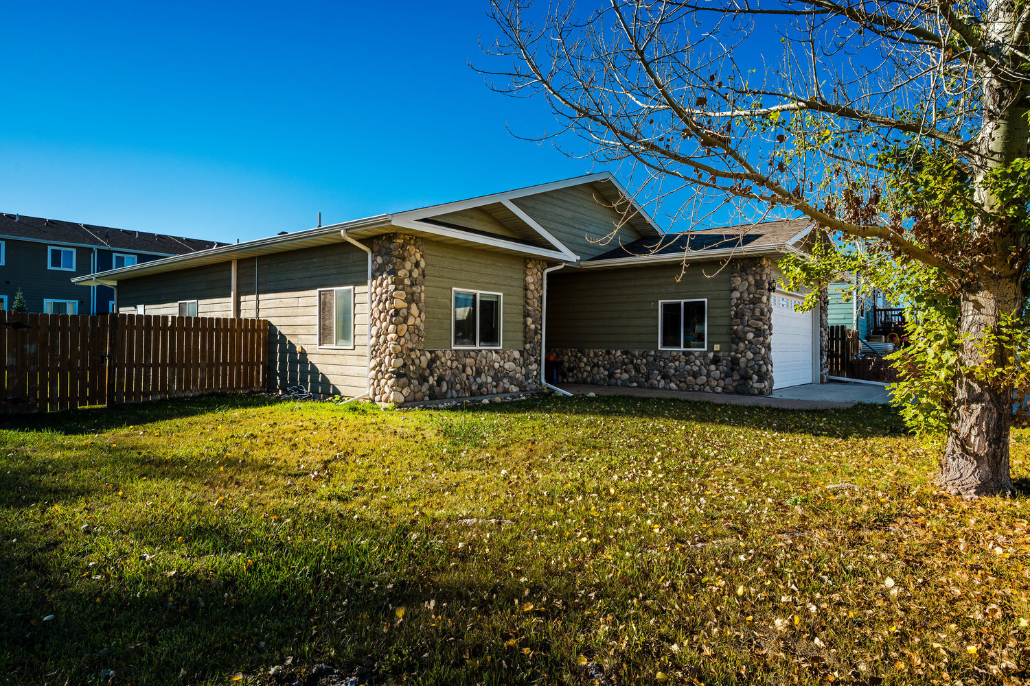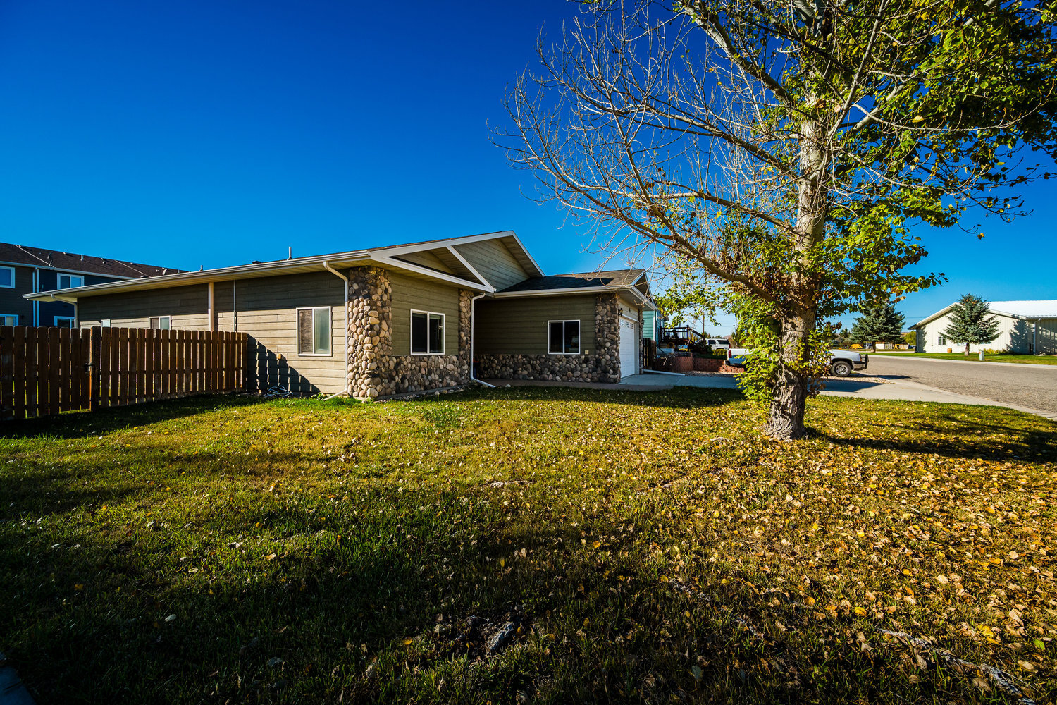 Welcome to this beautifully maintained one-level home nestled in the quaint town of Ranchester. Home is move-in ready with numerous upgrades (furnace & heat pump, north windows, roof, gutters, water heater, and most appliances. Natural gas conversion in 2021). Offering ADA accessibility, this home blends comfort, functionality, and rustic charm. Stamped concrete walkway leads to a custom front door framed with river rock wainscotting. More river rock inside the open concept living space with vaulted ceilings and knotty pine trim & doors. Wood-burning stove adds heat for cozy Wyoming winters. Kitchen features bar seating and Kraft-maid soft close cabinets. Inviting primary suite includes a walk-in closet and spacious four-fixture en-suite. Additional flex space offers versatility - family room, office, or even a fourth bedroom. Access the partially covered back patio through this space or the primary. Fully fenced back yard is ideal for children or pets, but can easily be accessed through the large gate for storing those ATV's. Custom-built storage shed adds convenience and utility. Located across from Rotary Park Pond with easy access to walking paths and TR Elementary, this home is perfectly positioned for both relaxation and community connection.