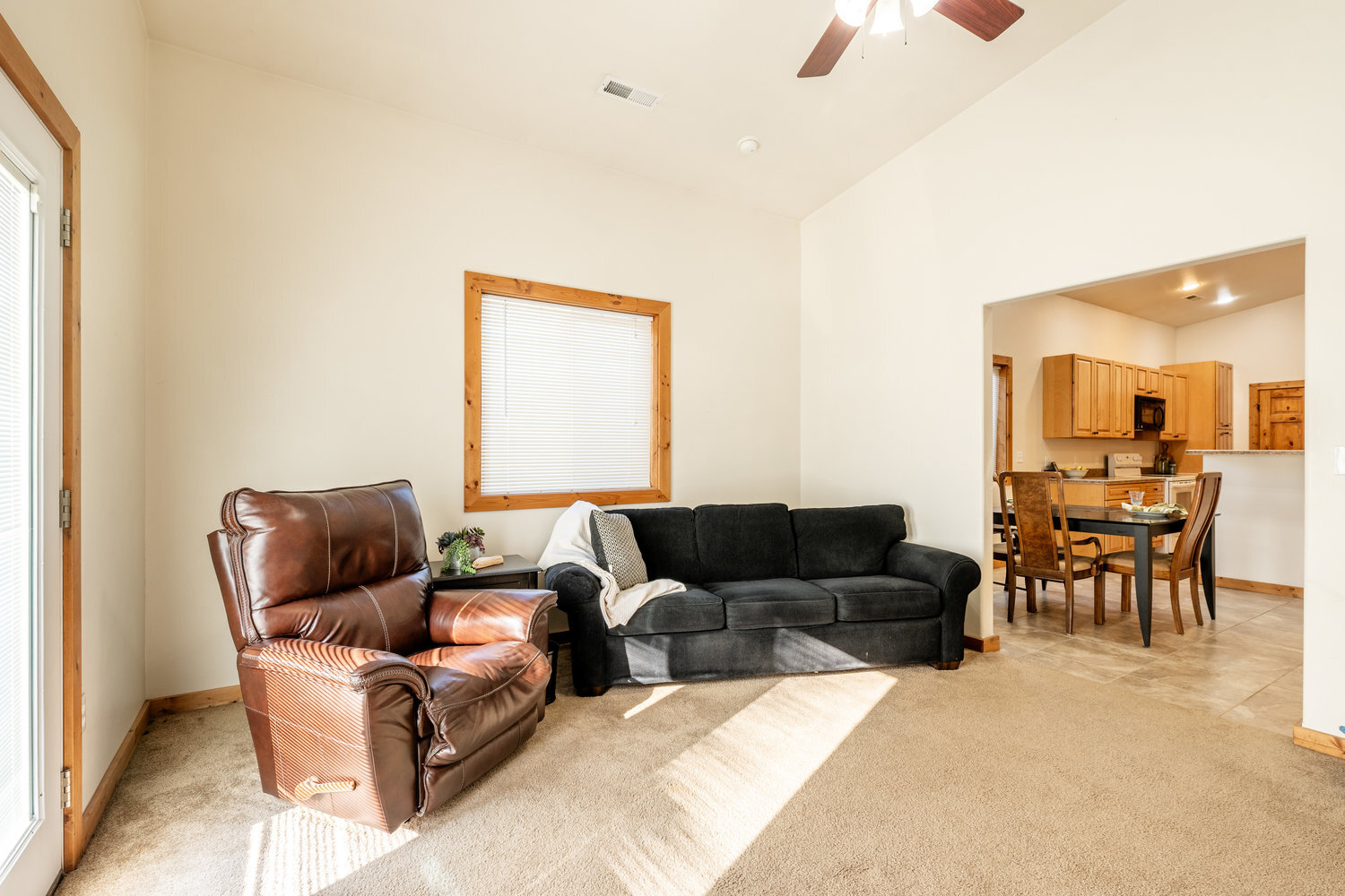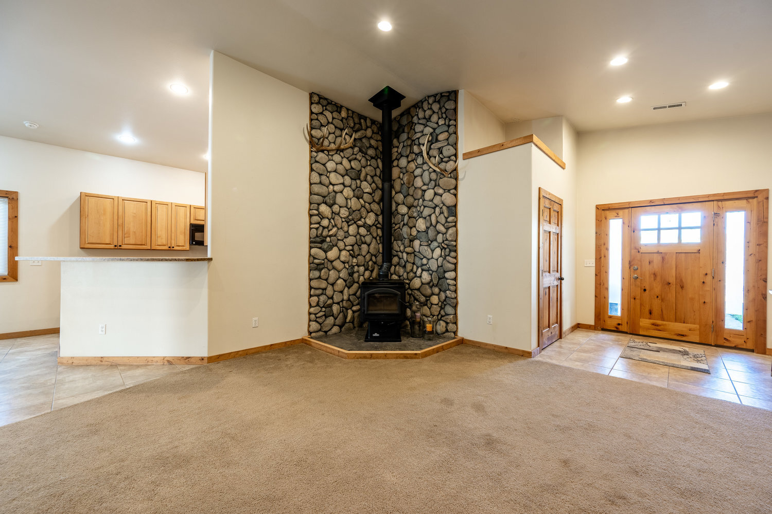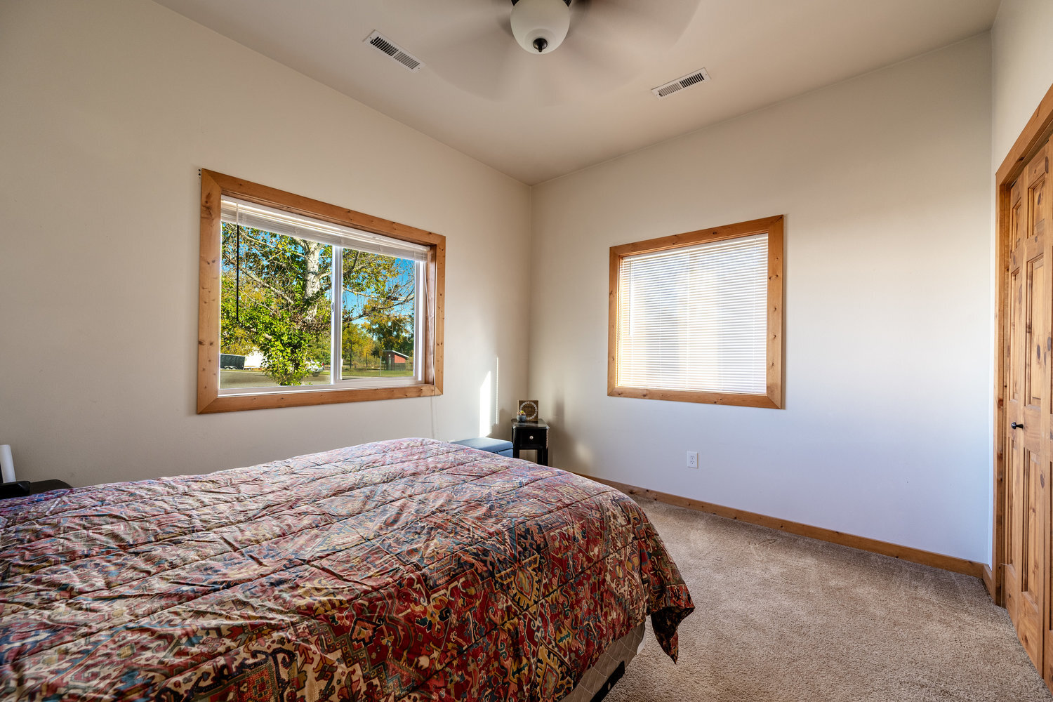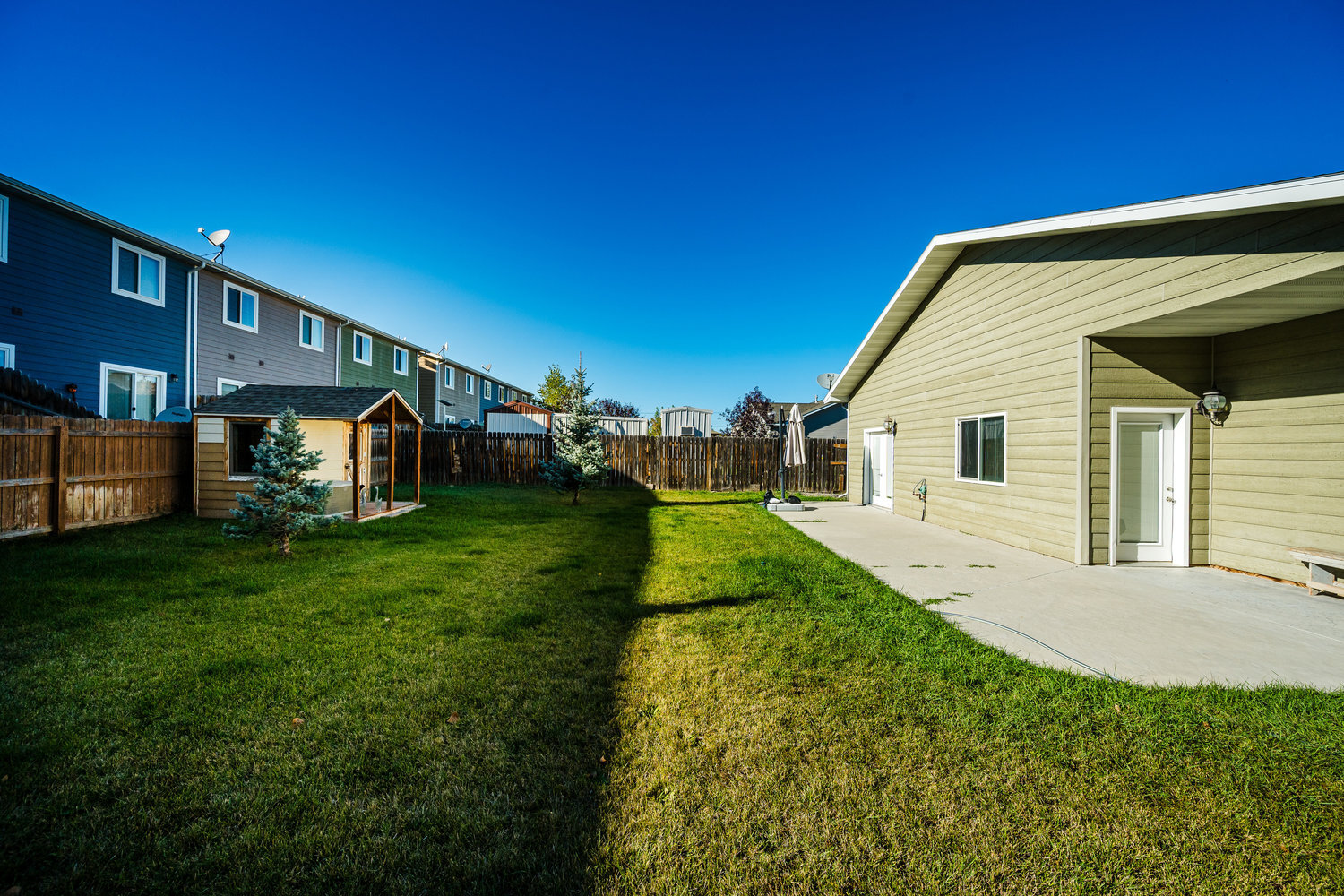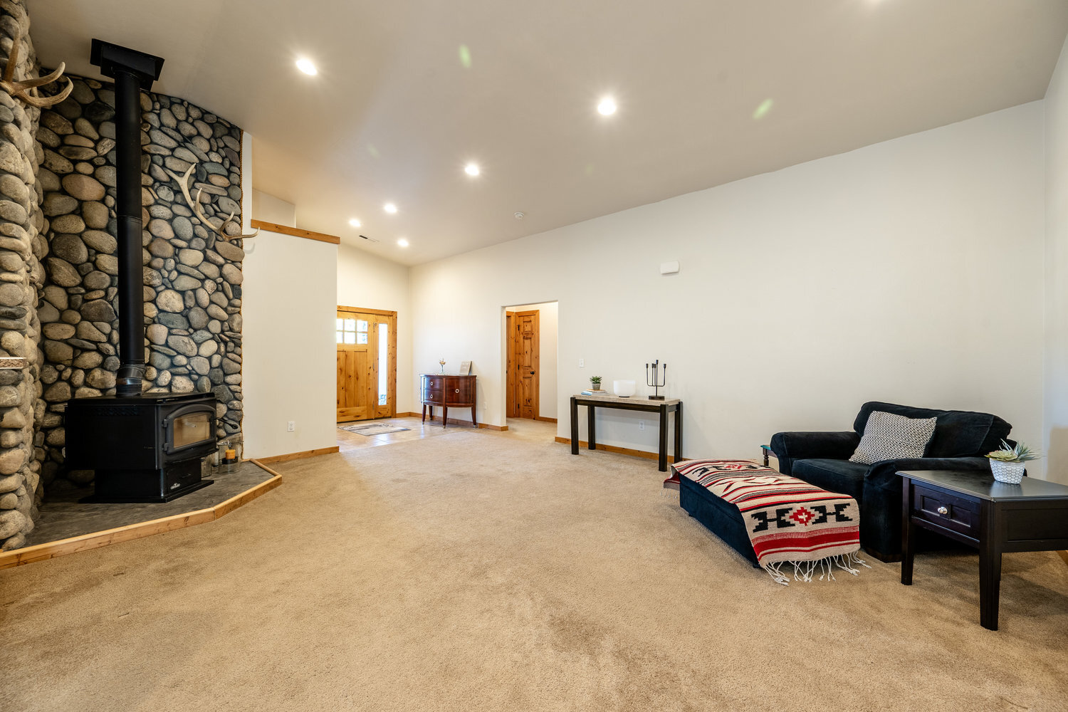 Welcome to this beautifully maintained one-level home nestled in the quaint town of Ranchester. Home is move-in ready with numerous upgrades (furnace & heat pump, north windows, roof, gutters, water heater, and most appliances. Natural gas conversion in 2021). Offering ADA accessibility, this home blends comfort, functionality, and rustic charm. Stamped concrete walkway leads to a custom front door framed with river rock wainscotting. More river rock inside the open concept living space with vaulted ceilings and knotty pine trim & doors. Wood-burning stove adds heat for cozy Wyoming winters. Kitchen features bar seating and Kraft-maid soft close cabinets. Inviting primary suite includes a walk-in closet and spacious four-fixture en-suite. Additional flex space offers versatility - family room, office, or even a fourth bedroom. Access the partially covered back patio through this space or the primary. Fully fenced back yard is ideal for children or pets, but can easily be accessed through the large gate for storing those ATV's. Custom-built storage shed adds convenience and utility. Located across from Rotary Park Pond with easy access to walking paths and TR Elementary, this home is perfectly positioned for both relaxation and community connection.