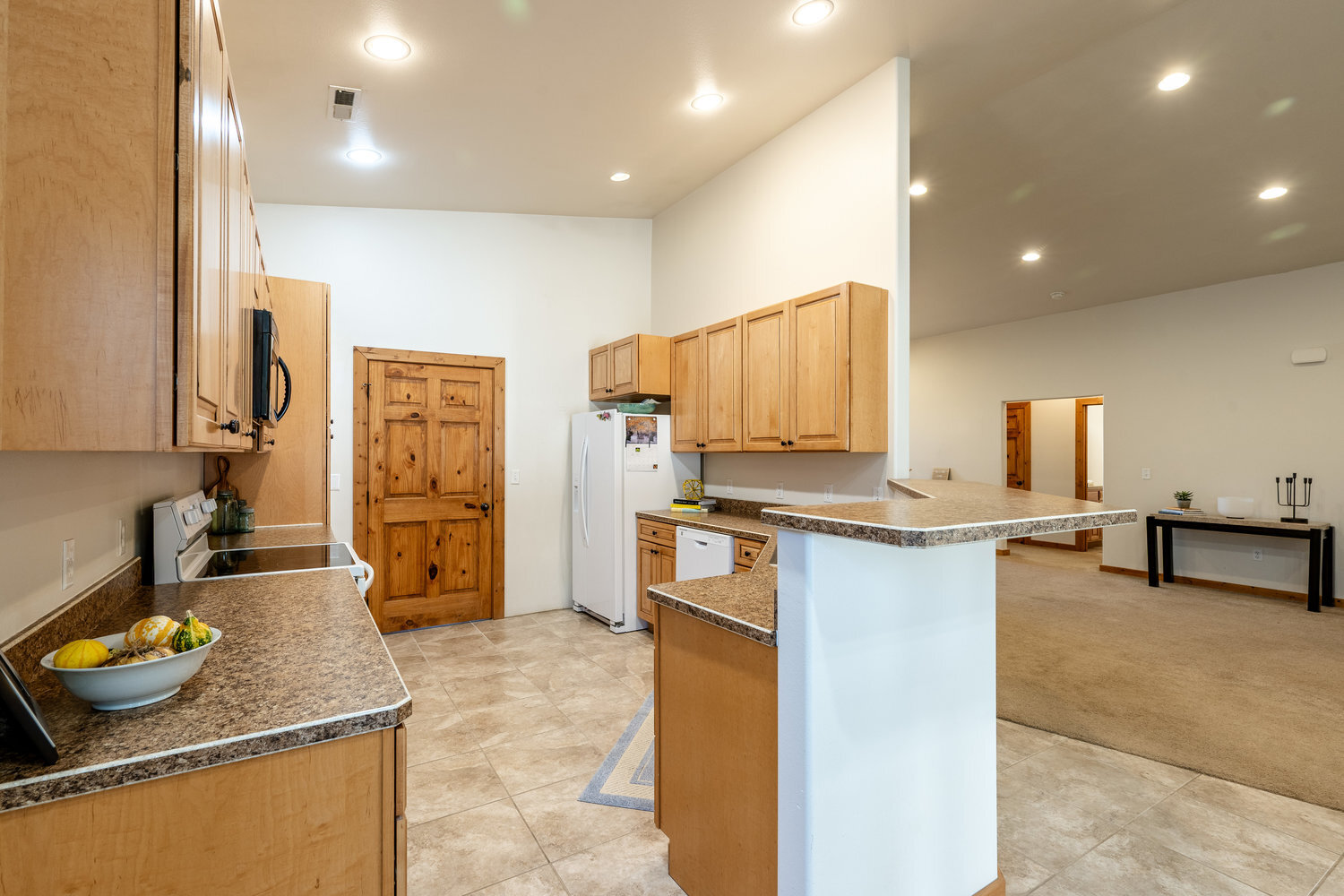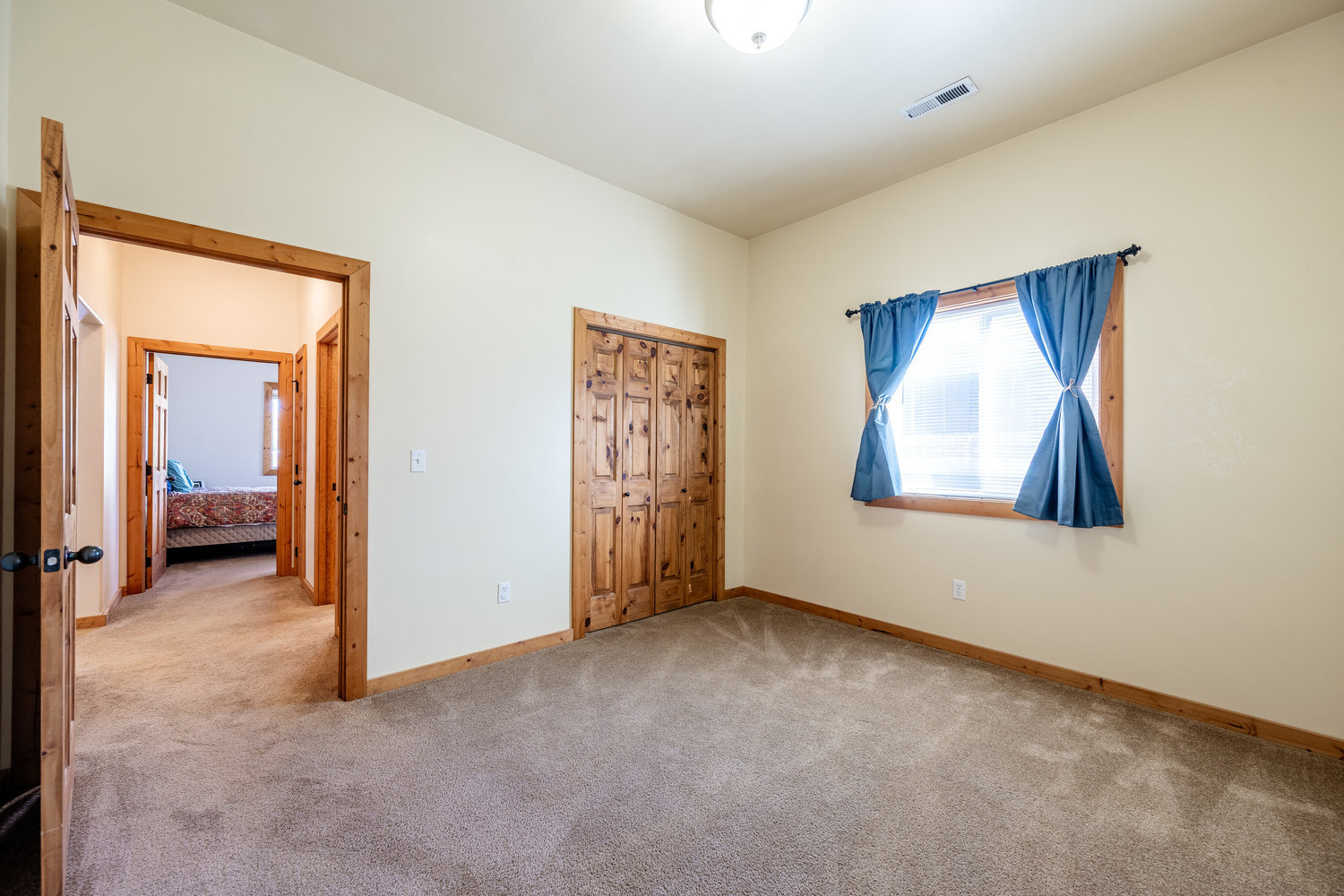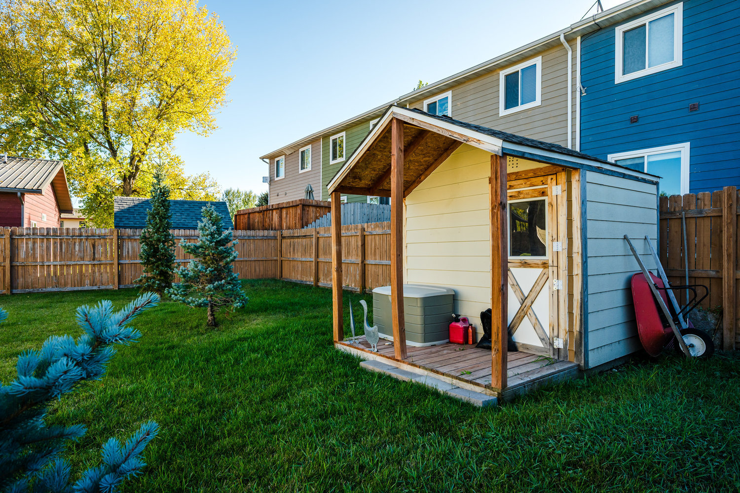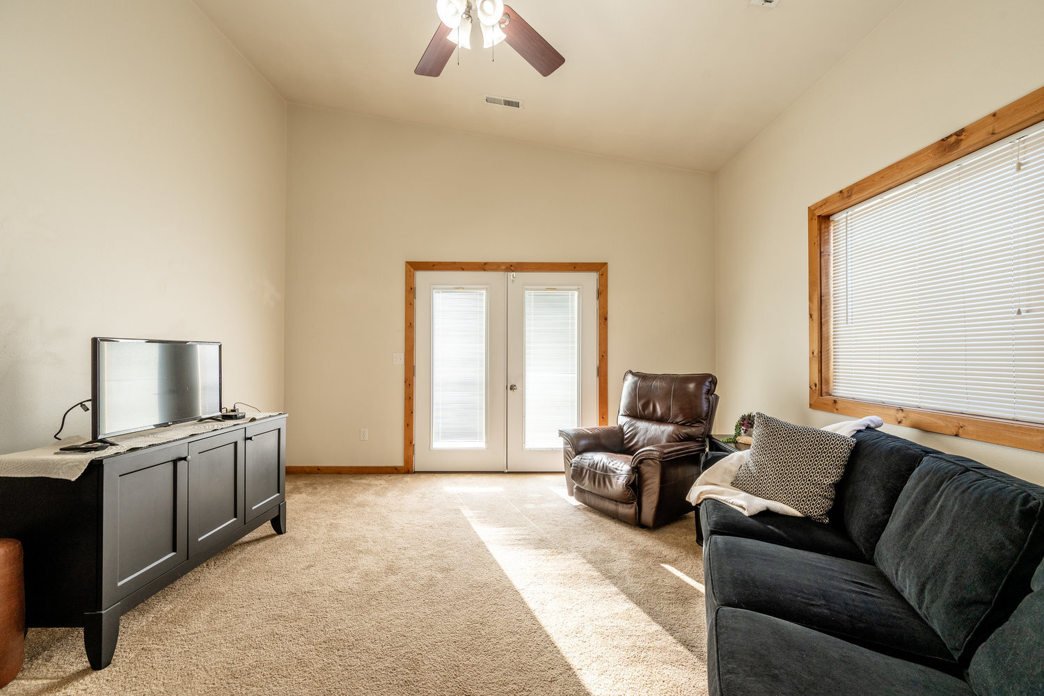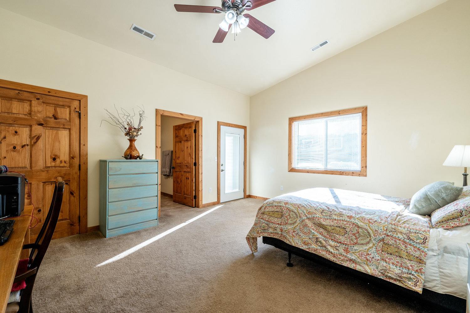 Welcome to this beautifully maintained one-level home nestled in the quaint town of Ranchester. Home is move-in ready with numerous upgrades (furnace & heat pump, north windows, roof, gutters, water heater, and most appliances. Natural gas conversion in 2021). Offering ADA accessibility, this home blends comfort, functionality, and rustic charm. Stamped concrete walkway leads to a custom front door framed with river rock wainscotting. More river rock inside the open concept living space with vaulted ceilings and knotty pine trim & doors. Wood-burning stove adds heat for cozy Wyoming winters. Kitchen features bar seating and Kraft-maid soft close cabinets. Inviting primary suite includes a walk-in closet and spacious four-fixture en-suite. Additional flex space offers versatility - family room, office, or even a fourth bedroom. Access the partially covered back patio through this space or the primary. Fully fenced back yard is ideal for children or pets, but can easily be accessed through the large gate for storing those ATV's. Custom-built storage shed adds convenience and utility. Located across from Rotary Park Pond with easy access to walking paths and TR Elementary, this home is perfectly positioned for both relaxation and community connection.