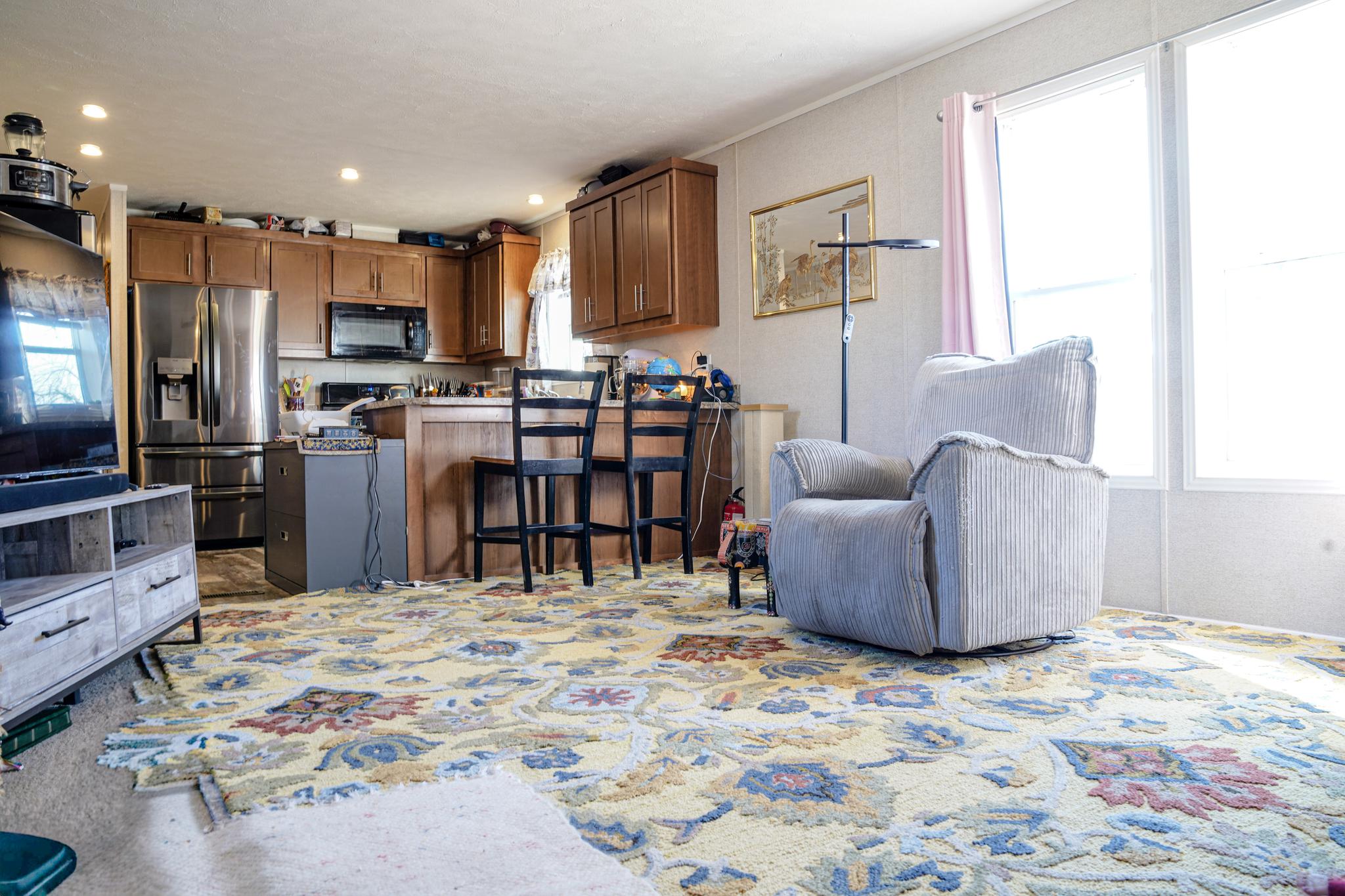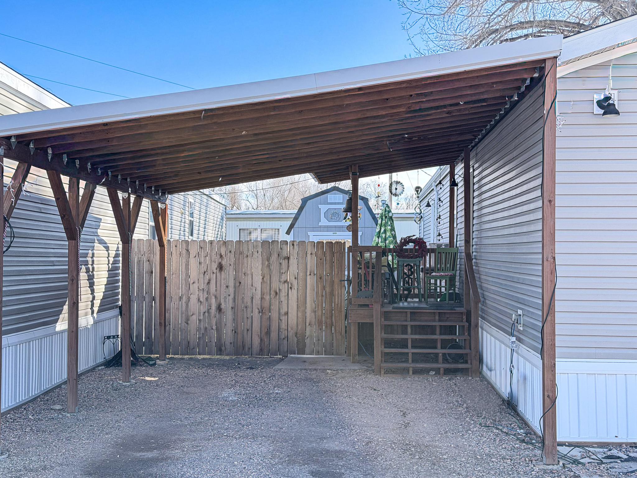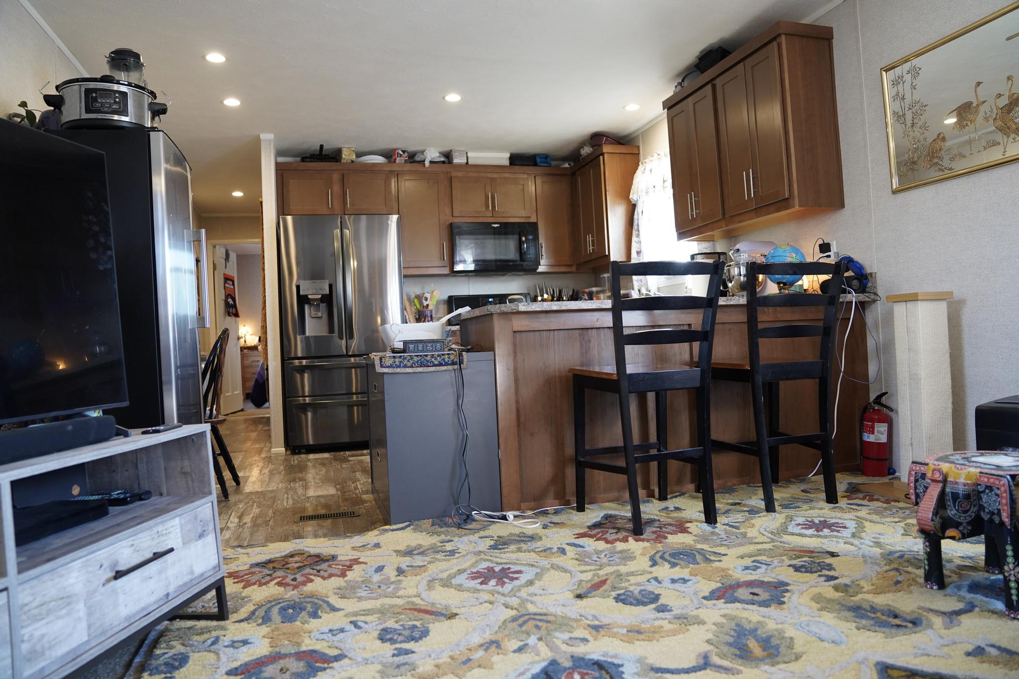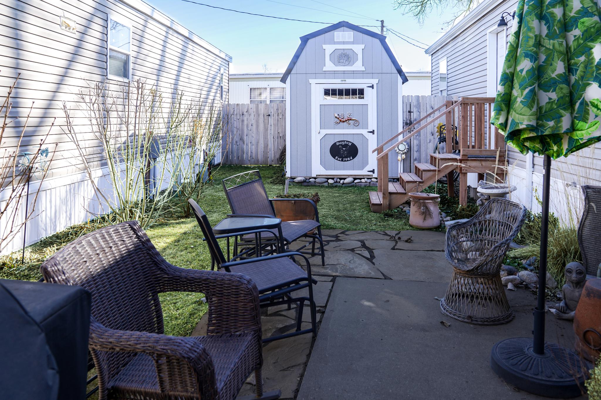 Arrive home to a well-kept, one-owner 2020 manufactured home that feels quietly inviting from the start. The kitchen is anchored by rich, dark cabinetry and quality appliances. With two bedrooms and two bathrooms, the layout offers breathing room for guests, a workspace, or simply a bit more privacy. Step outside and you'll find a yard that feels thoughtfully composed: fully fenced, layered with flowers and plantings, and finished with a flagstone patio. A covered carport adds practical shelter, and the hickory shed is a welcome bonus for storage, projects, and all the extras that come with everyday life. NO REAL ESTATE. Mobile Home only. Park manager approval required. Buyer to review and verify all lease terms; due diligence encouraged.